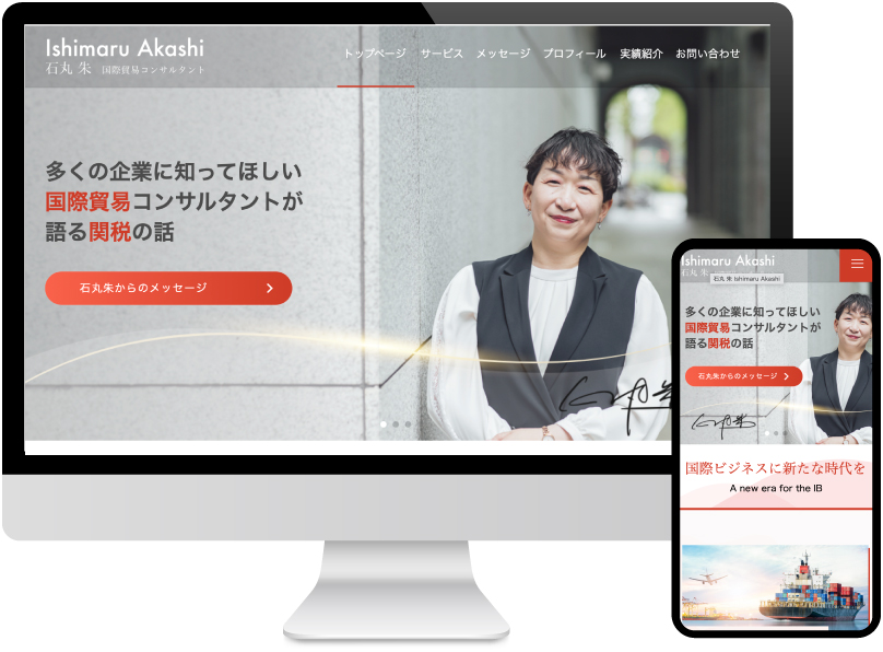 国際ビジネスや関税制度の専門家「国際貿易コンサルタント」として活躍する石丸朱さんの公式サイトを制作しました。